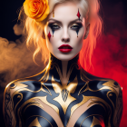 A striking figure with platinum blonde hair adorned with a vibrant orange flower. She has elaborate makeup and intricate body art featuring gold and black patterns, surrounded by swirling smoke.