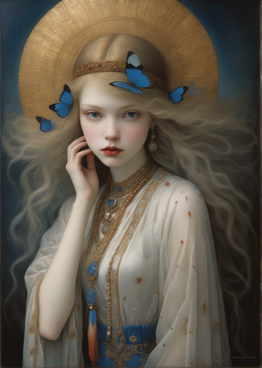 Young woman with golden halo and butterfly accessories in vintage dress, contemplating under starry sky with floating balloon
