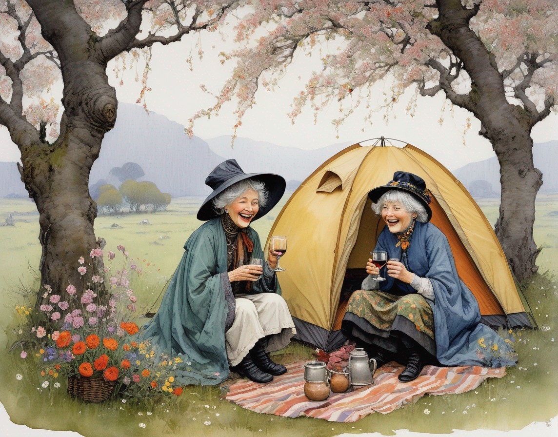Two elderly women laugh joyously while camping, toasting with wine glasses beside a yellow tent under a blooming tree.