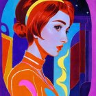 A vibrant surreal landscape features abstract shapes and vivid colors, with figures standing against a backdrop of floating spheres and a glowing horizon, evoking a dreamlike atmosphere.