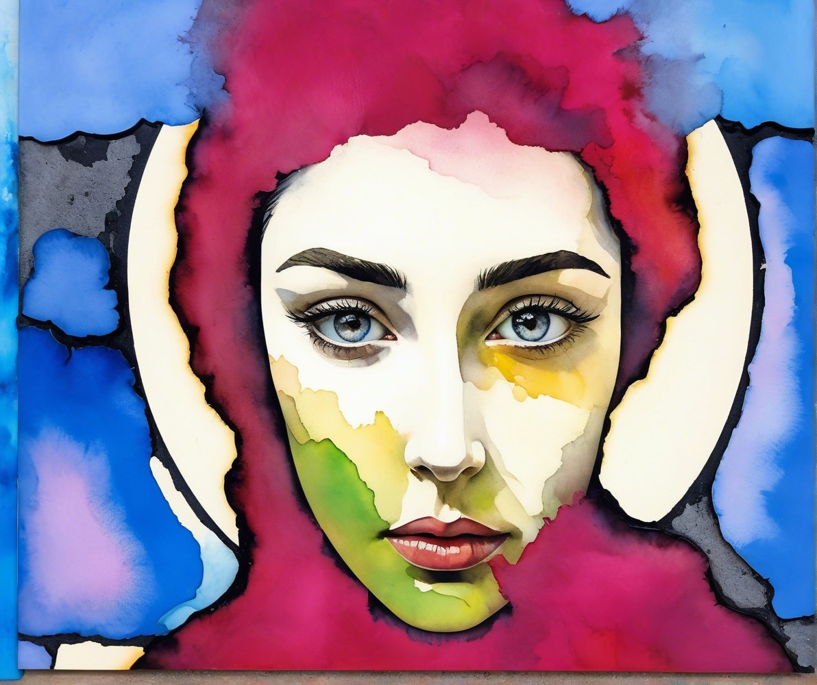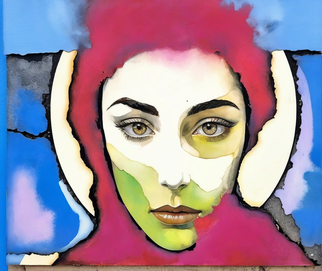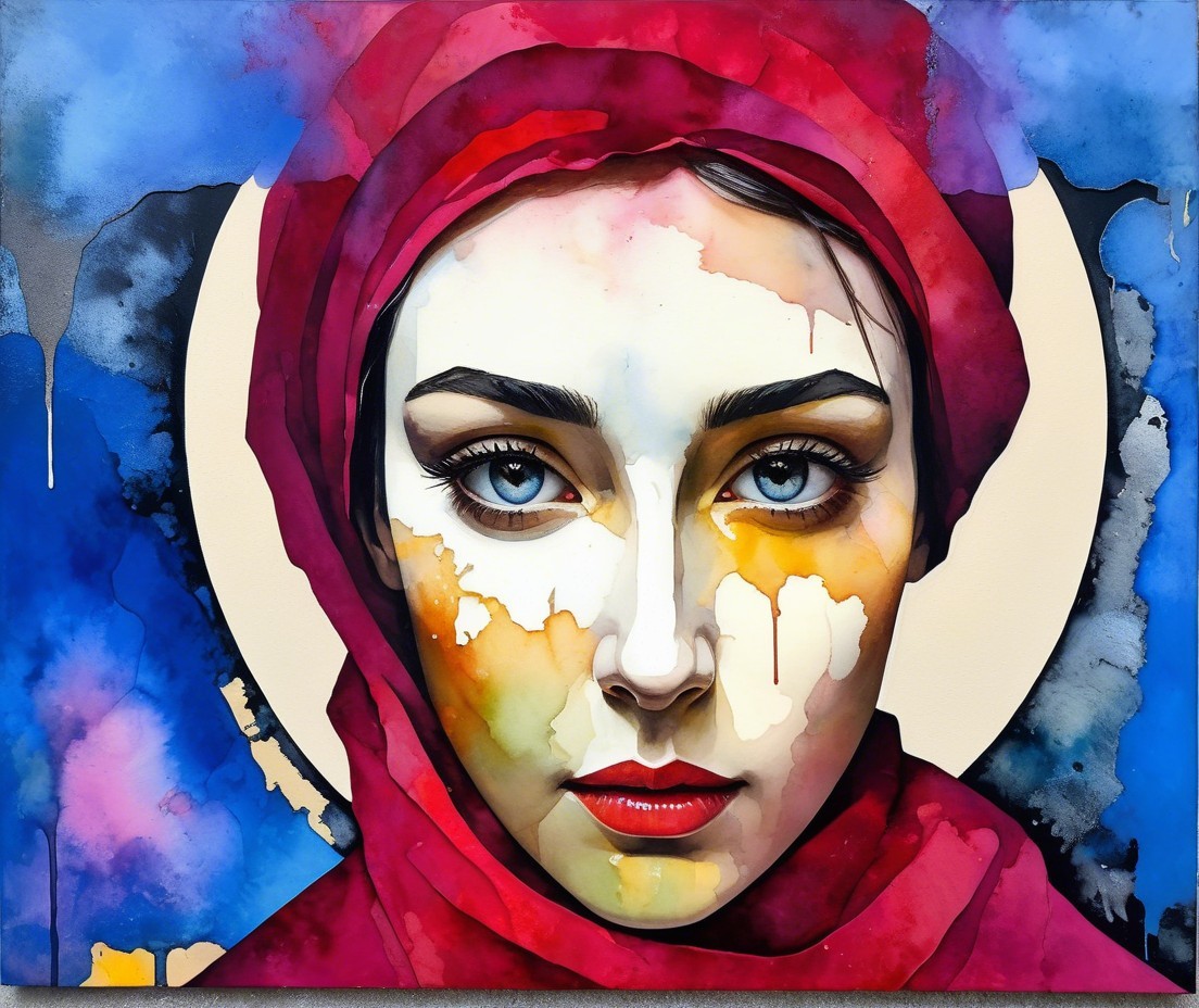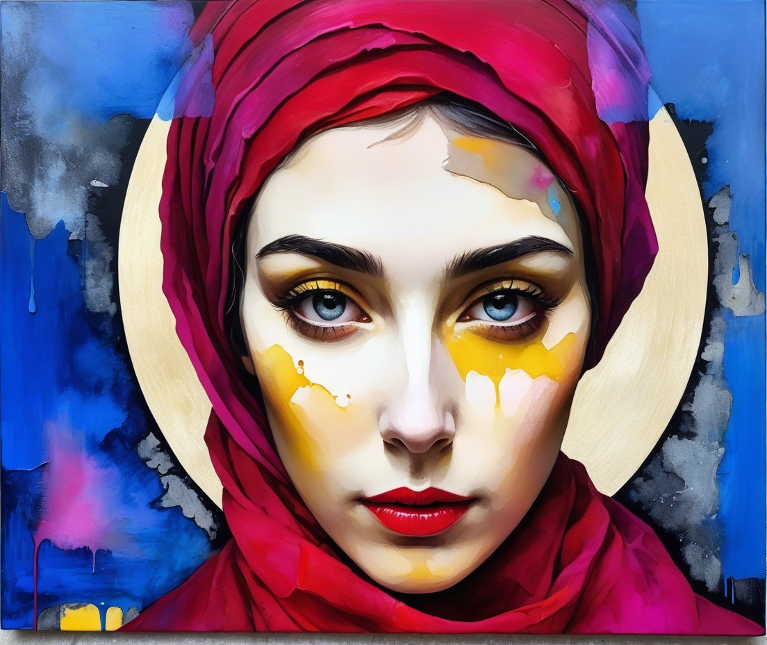 Ethereal portrait immersed in dimly lit, headscarf in cluttered ambiance, lifelike but textured with resin and wax and gouache, expressionless deep-set eyes, weathered cracks, spatialism, joyful, complex color scheme magenta-red dark-yellow light-blue grey-black, ash and watercolor swirls, asymmetrical entropy, dyed, watery coloring flares, thinned paint in high definition, circular geometric motif, futuristic vibe, contrasting background, brightness 1.3, screeching coloring with opaque transitions, simplistic surrealism, detailed realism, moody lighting,styled by Ed Binkley and Remedios Varo and Josephine Wall. Dynamic lighting, squiggly line-art features, tall and stacked lines, dof, bokeh, debeh, wavery dappled lighting, zentangle, novelty architecture, stylized chipped patchwork, pastel coloring, kinetic, liminal, 3D effects, anisotropic filtering 1.7, raytraced shadows 1.8, divisionism, sgraffito, stacked-up perspective, charcoal textures, indistinguishable, alcohol ink bleeding edges, golden lines, intricate geometries, mixed media masterpiece, vibrant art-nouveau color tones, gradient inking colors,negative lucas numbers, patchwork theme, banging, scruffy, restraint, raw, exuding joyful pencil sketch art blend, painterly style, rich and saturated colors, bold and detailed brushwork, campy elegance, space-age & pulp sci-fi inspiration, psychedelic, futuristic, glowing,