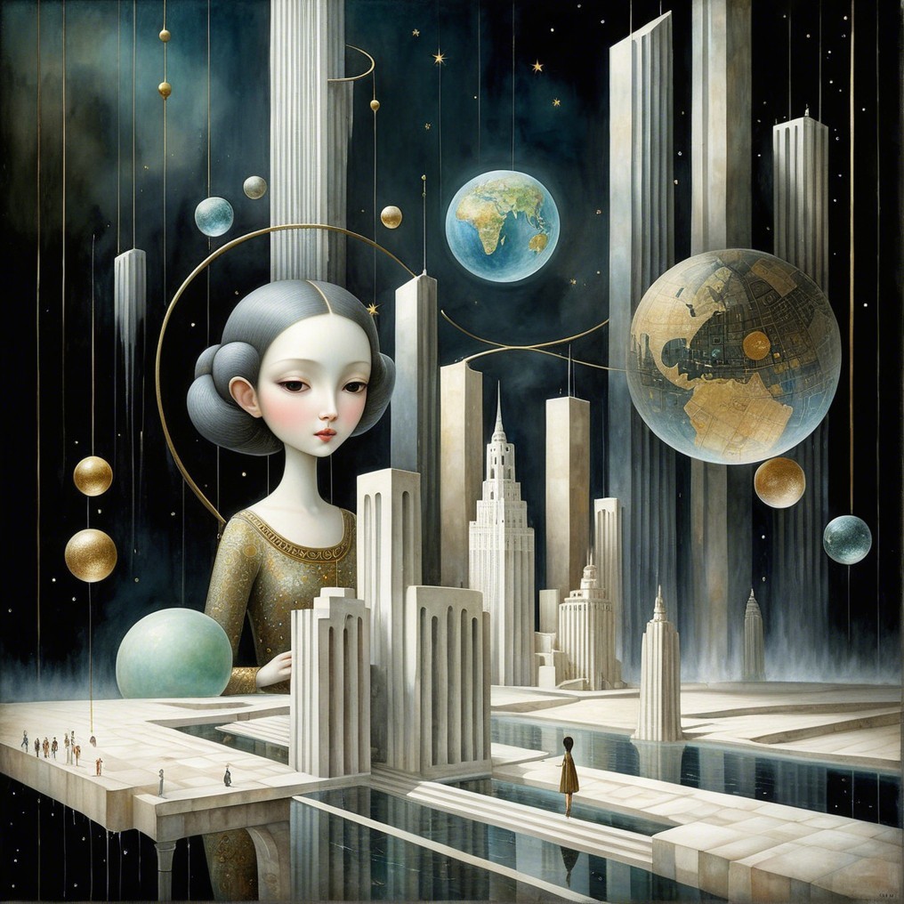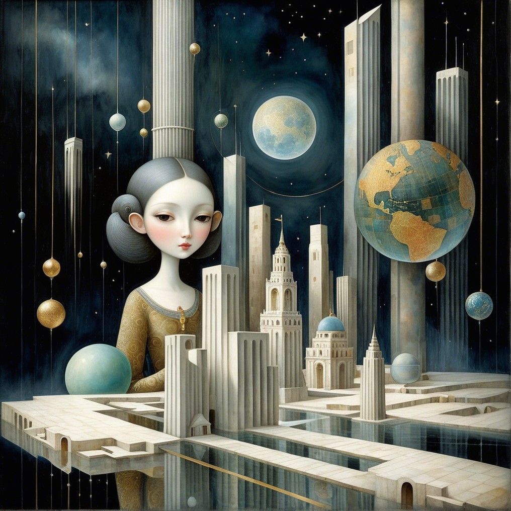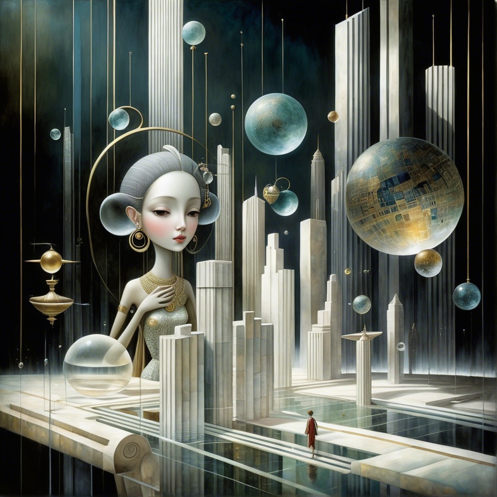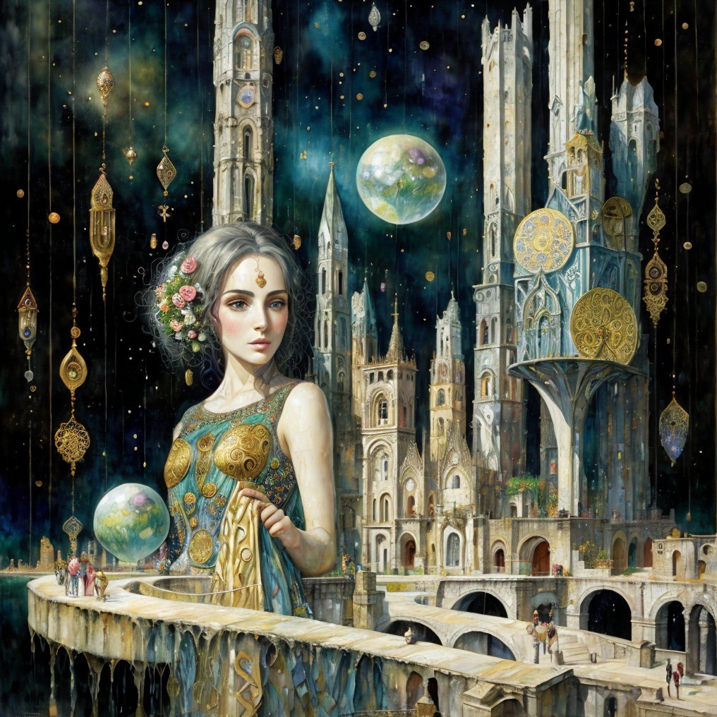 A godlike woman stands in the courtyard of a human world, surveying the intricate columns and surreal architecture.