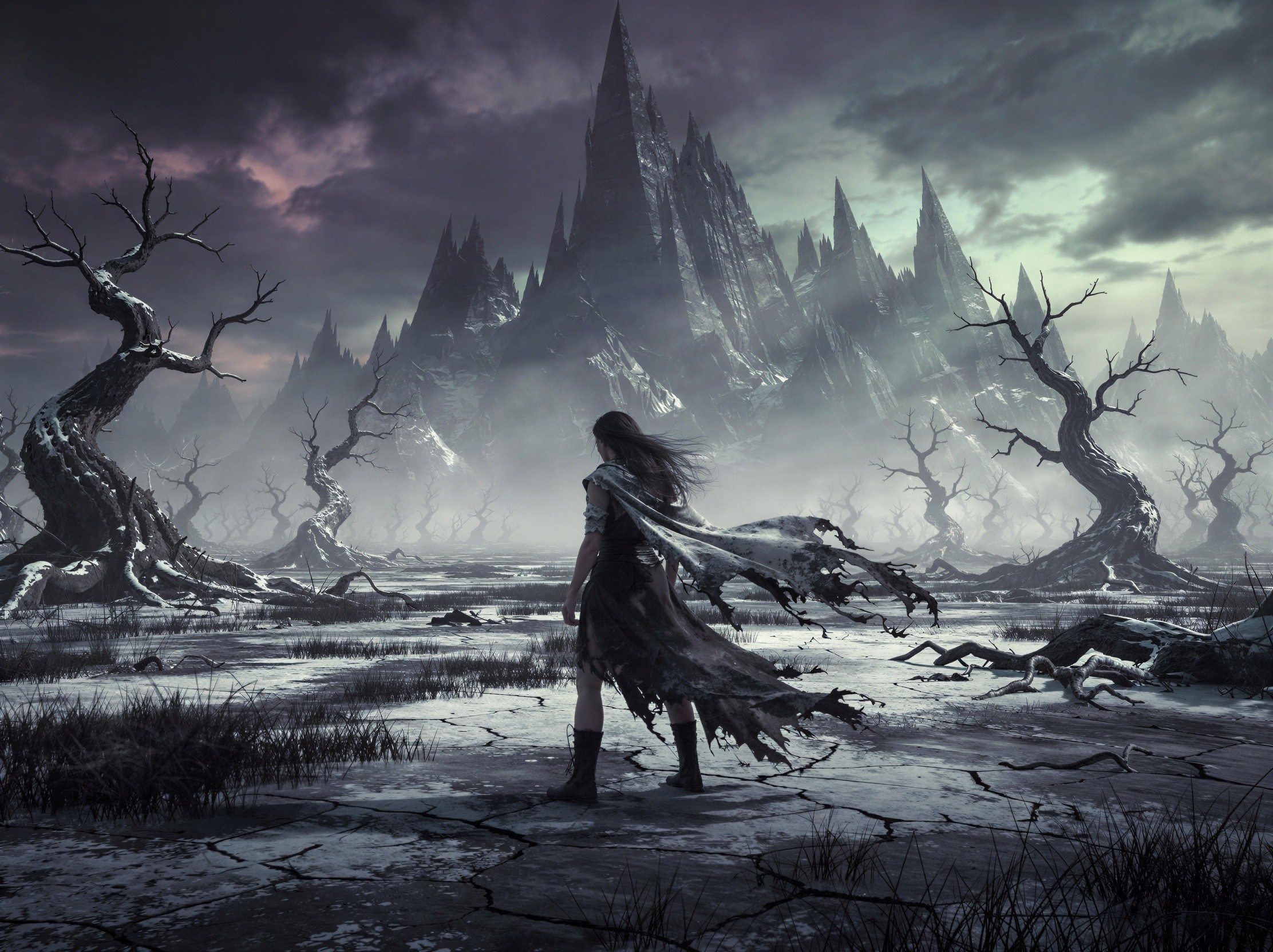 A solitary figure in a worn cloak stands on a desolate plain, surrounded by jagged mountains under a twilight sky. Gnarled trees reach out like skeletal hands, creating an atmosphere of haunting isolation.
