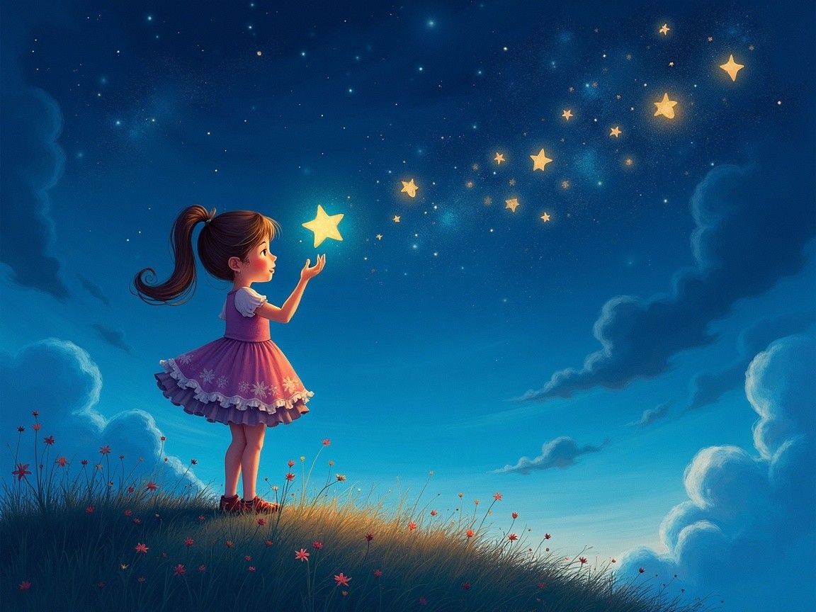 A young girl in a colorful dress stands on a hill, reaching up to a vibrant trail of stars shooting across a twilight sky; to her delight, one star lands in her hand.
