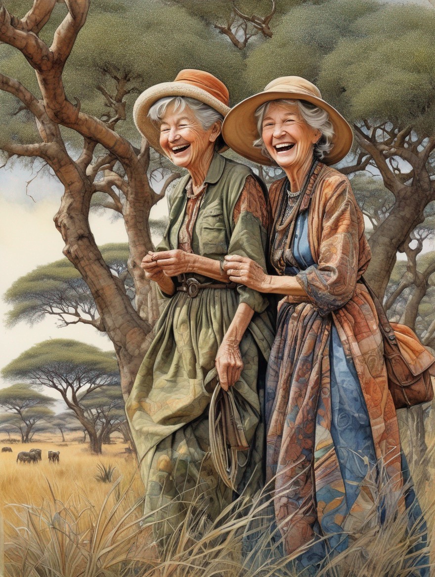 + Prompt:Two litte old ladies laughing and smiling on a safari to the savanna of Africa . in the style of Inge Look. Cartoonish. Whimsical, gay, frivolous, charming. earthy colors.