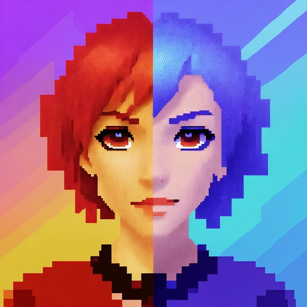Prompt: "Create a pixel art image of a character with attention to details and a distinctive personality. Include elements in the image that reflect the character's uniqueness, and focus on clear and contrasting colors. The image should be striking and captivating, capturing the character's unique style."