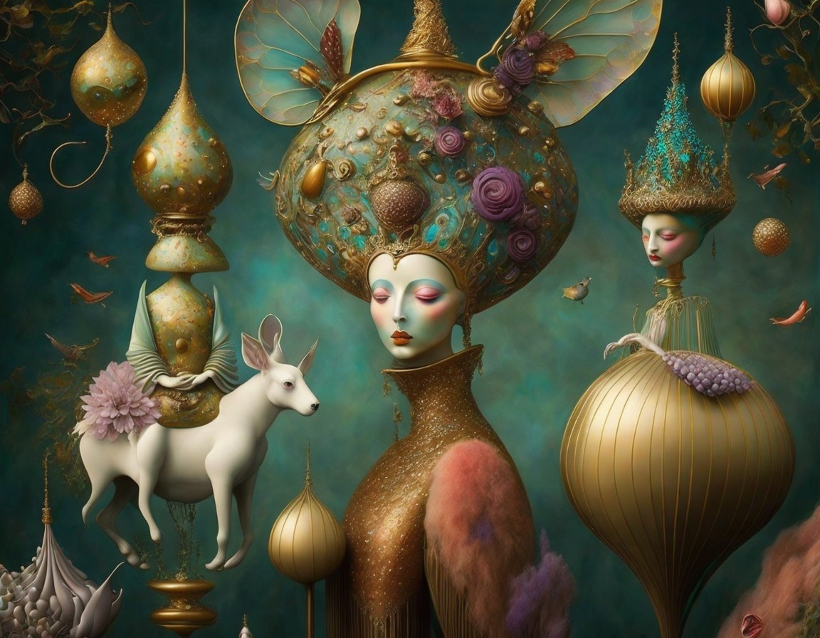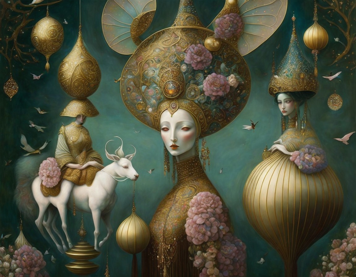 The image features ethereal figures adorned in elaborate, flowing garments with intricate patterns. They're surrounded by luminous lanterns against a mystical, dreamlike blue background.