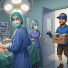 In a bright surgical room, a surgeon and medical staff in scrubs focus on an operation, while a smiling delivery person in an Amazon uniform enters with a package, creating a humorous contrast.
