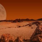 A surreal landscape featuring towering rock formations and floating islands under a deep orange sky. Large planets and moons hover in the background, enhancing the alien atmosphere.