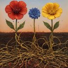 The "Web of Life" where life is nurtured via a complex network. The image shows a connection between the red and yellow flowers, where resources are shared. The blue flower is unable to survive without the support of the network, in this case a fungal network which provides nutrients. It's both an example of nature at work and a metaphor.