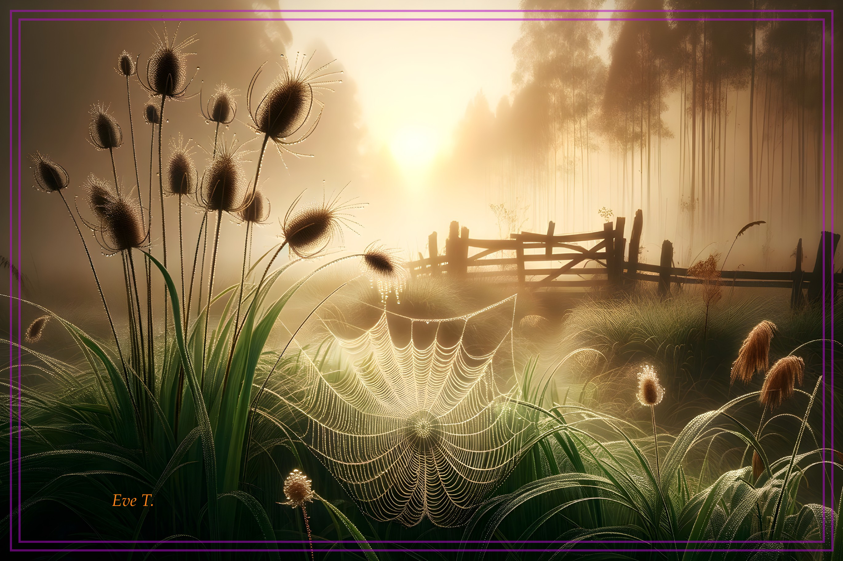 A tranquil nature scene with a sunrise, dewy spiderweb, teasel plants, and a wooden fence amid misty forest background.