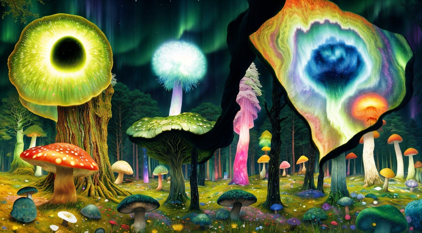forest with trees, colorful rocks and glowing green mushroom, red and pink mist, fog, cosmic aurora borealis and starry nightsky, by Tomasz Alen Kopera, Dariusz Zawadzki, Gustav Klimt and Picasso.