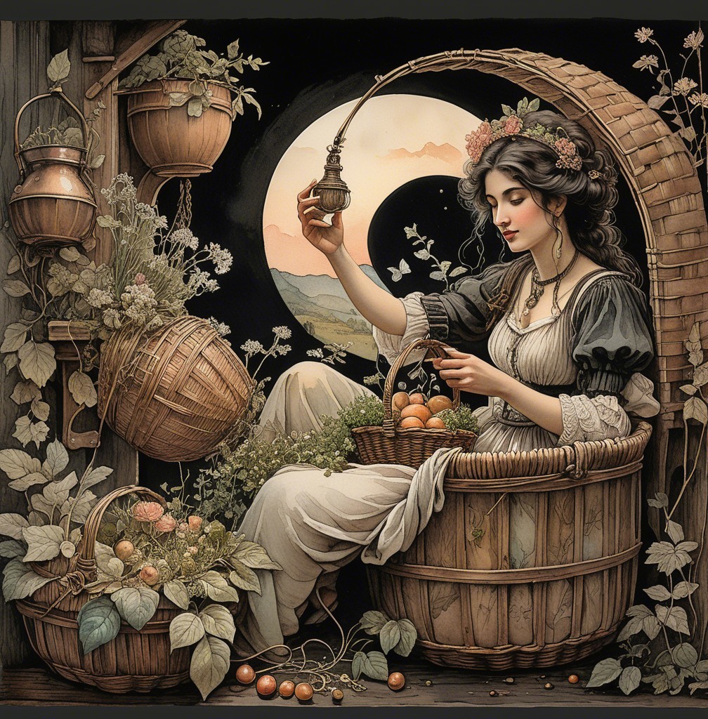 Two women engage in gathering herbs and vegetables in a rustic setting. One carefully arranges plants while the other inspects their basket, illuminated by a soft, warm light.