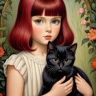 A young girl with a bob haircut holds a sleek black cat. Surrounded by lush greenery and gentle bubbles, her large blue eyes convey innocence and curiosity. The scene feels enchanting and serene.