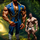 The image features two muscular figures standing in a lush, green forest. One dressed in an ornate blue outfit, the other in minimal swimwear, showcasing impressive physiques against the vibrant backdrop.