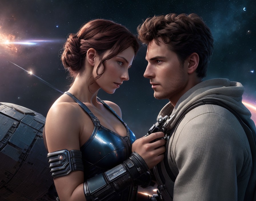 Woman and a man engage in a space battle. They are rugged warriors. The woman and man fight each other.