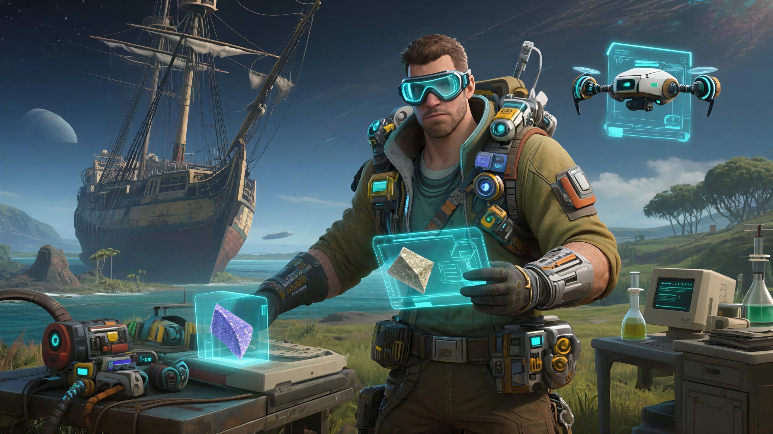 Prompt: a male rpg character. an explorer or field researcher, equally at home in the laboratory or wilderness. salvaging equipment fron a derilict ship in uncharted space. he has lots of advanced gadgets and an intelligent drone. he wears sci fi compute gear and goggles. holograms highlight valuable materials.