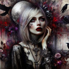 The artwork depicts a hauntingly beautiful woman with pale skin and striking red lips, surrounded by dark roses, crows, and an eerie moon, embodying a gothic and surreal aesthetic.