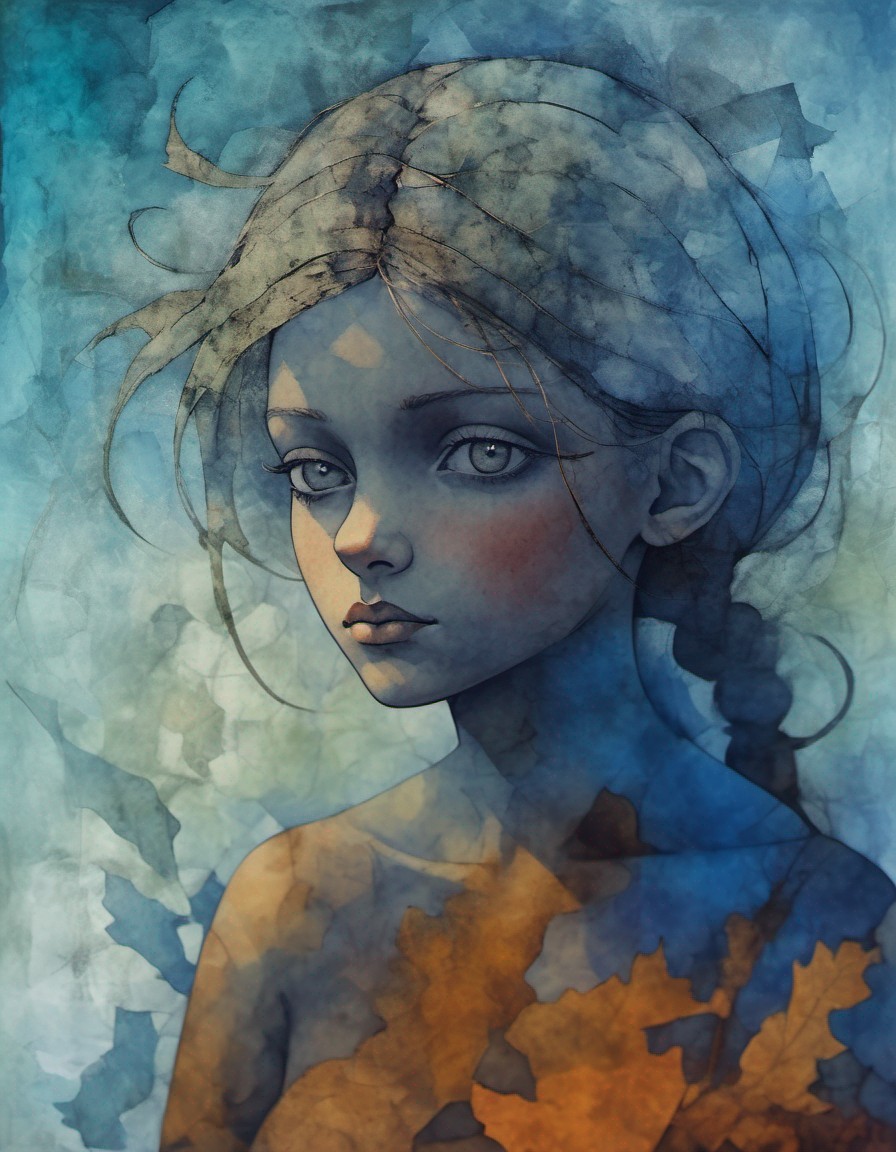 Beautiful woman, portrait in burnt umber, patina of ancient stone with moss, art brut, moody, somber, desaturated colors, in the style of Paul Klee, Arthur Rackham But wasn't it beautiful? Didn't we forget about the sad times for a while? smoke and gossamer, nostalgia, art brut, moody, somber, desaturated colors, in the style of Paul Klee, Arthur Rackham, Alphonse Mucha Patchwork pandemonium, portrait in plutonium, patina of ancient stone with moss, art brut, moody, somber, desaturated colors, in the style of Paul Klee, Banksy, Arthur Rackham, Prompt by KRW
