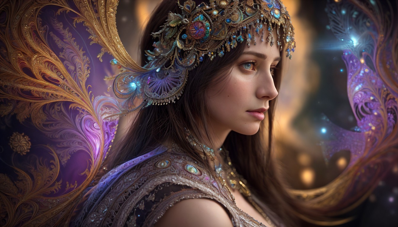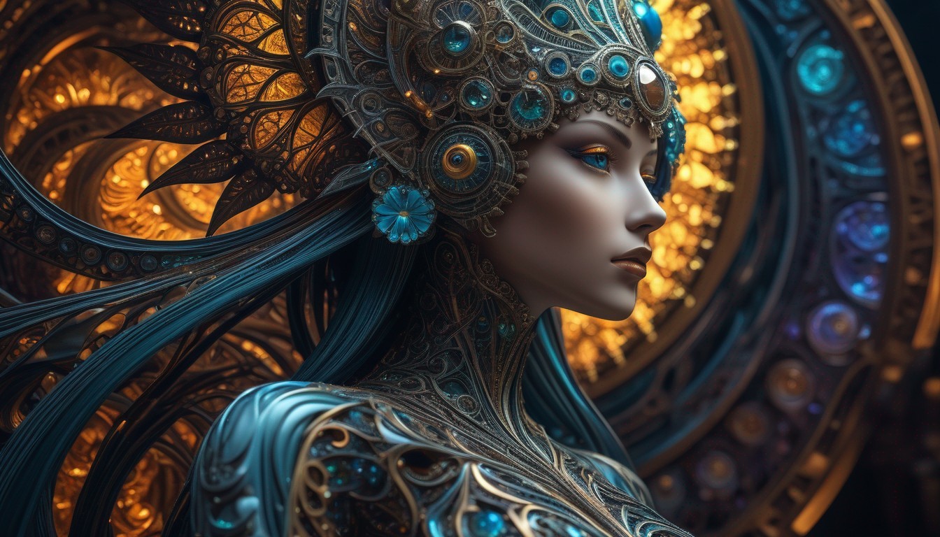 Detailed illustration of woman with ornate metallic headgear and intricate designs against glowing circular patterns