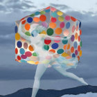 A graceful dancer in a white outfit strikes an elegant pose, twirling a colorful polka-dot scarf against a dramatic cloudy sky and mountain backdrop, embodying joy and movement.