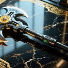 A futuristic axe rests on a sleek black marble surface, featuring glowing accents and intricate metallic designs. The weapon combines technological elements with a traditional axe shape.