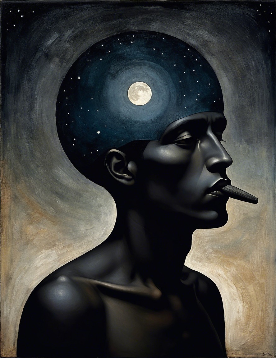 A striking portrait of a person with a dark silhouette, featuring a cosmic headdress. The background showcases a night sky filled with stars and a luminous full moon, evoking a mystical atmosphere.