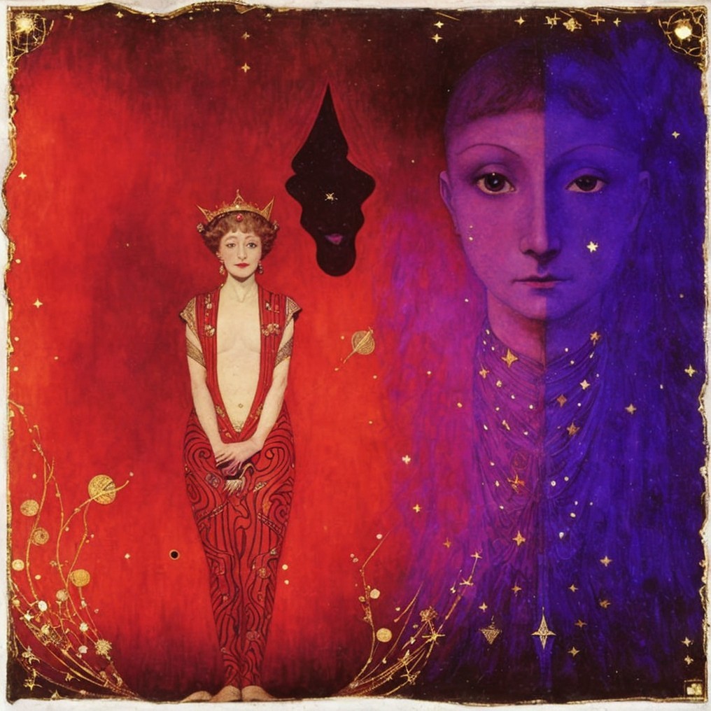 An Art Nouveau style image depicting two women flanking a masked face, one adorned in red with flowers, the other draped in a starry blue cloak.