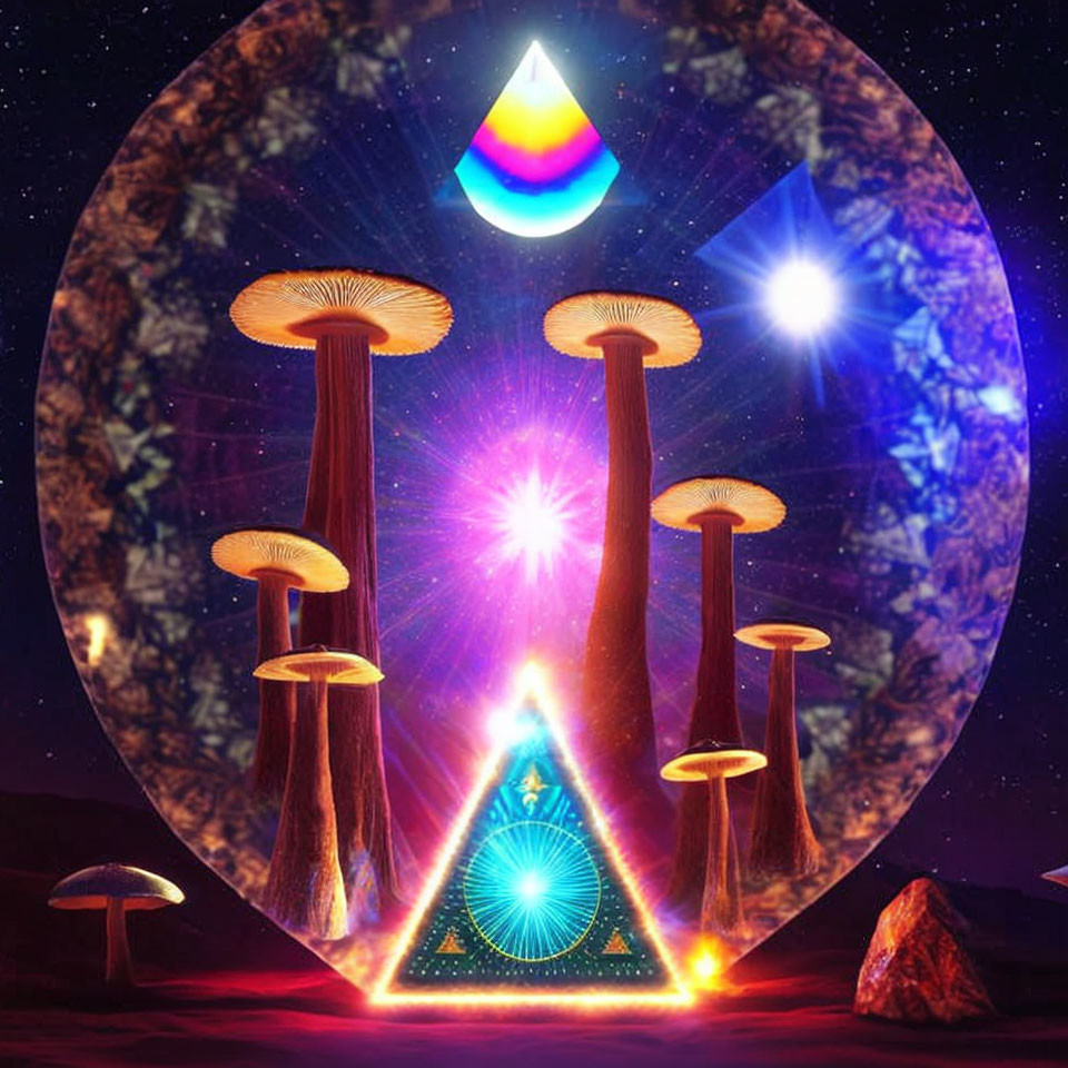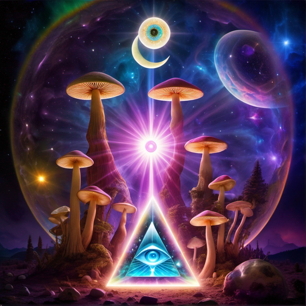 + Prompt:aliens time traveling and doing alchemy and magik. psilocybin mushrooms and crystal geodes. sacred geometry, mystical occult, hamsa, eye of providence, all seeing eye, talisman, esoteric, tarot, psychic pagan occult. pyramid sun and moon.