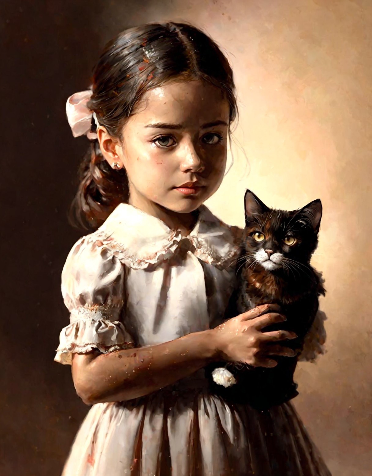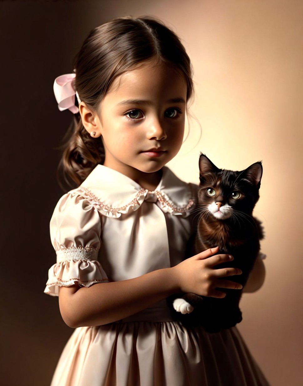 (Try from another user) - A young girl in a vintage dress holds a black cat close, with a melancholic expression. The background features soft, warm tones, creating a nostalgic and emotive atmosphere.