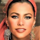 A glamorous model showcases striking makeup with bold red lips and dramatic eye shadow. She wears elegant, large earrings and a stylish red headscarf, exuding confidence and sophistication.