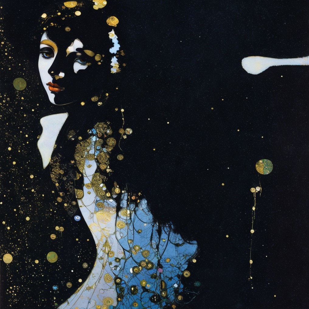 The artwork features a stylised female face in deep shadow, emerging from a black background, adorned with colorful patterns and golden accents, creating a dreamlike, ethereal atmosphere.