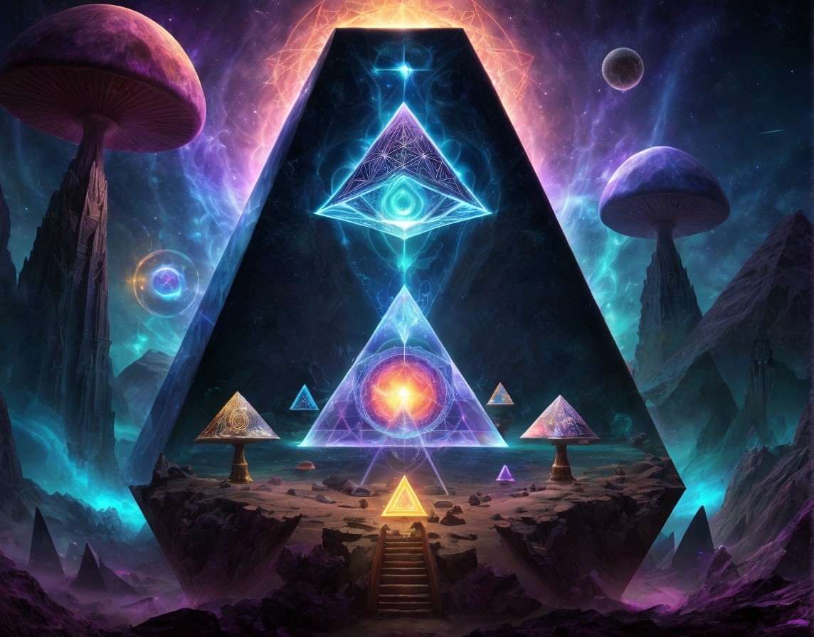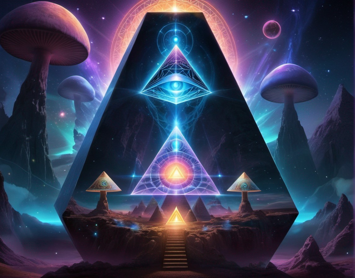 A vibrant digital art with a mystical pyramid, an all-seeing eye, glowing mushrooms, planets, and a cosmic backdrop.