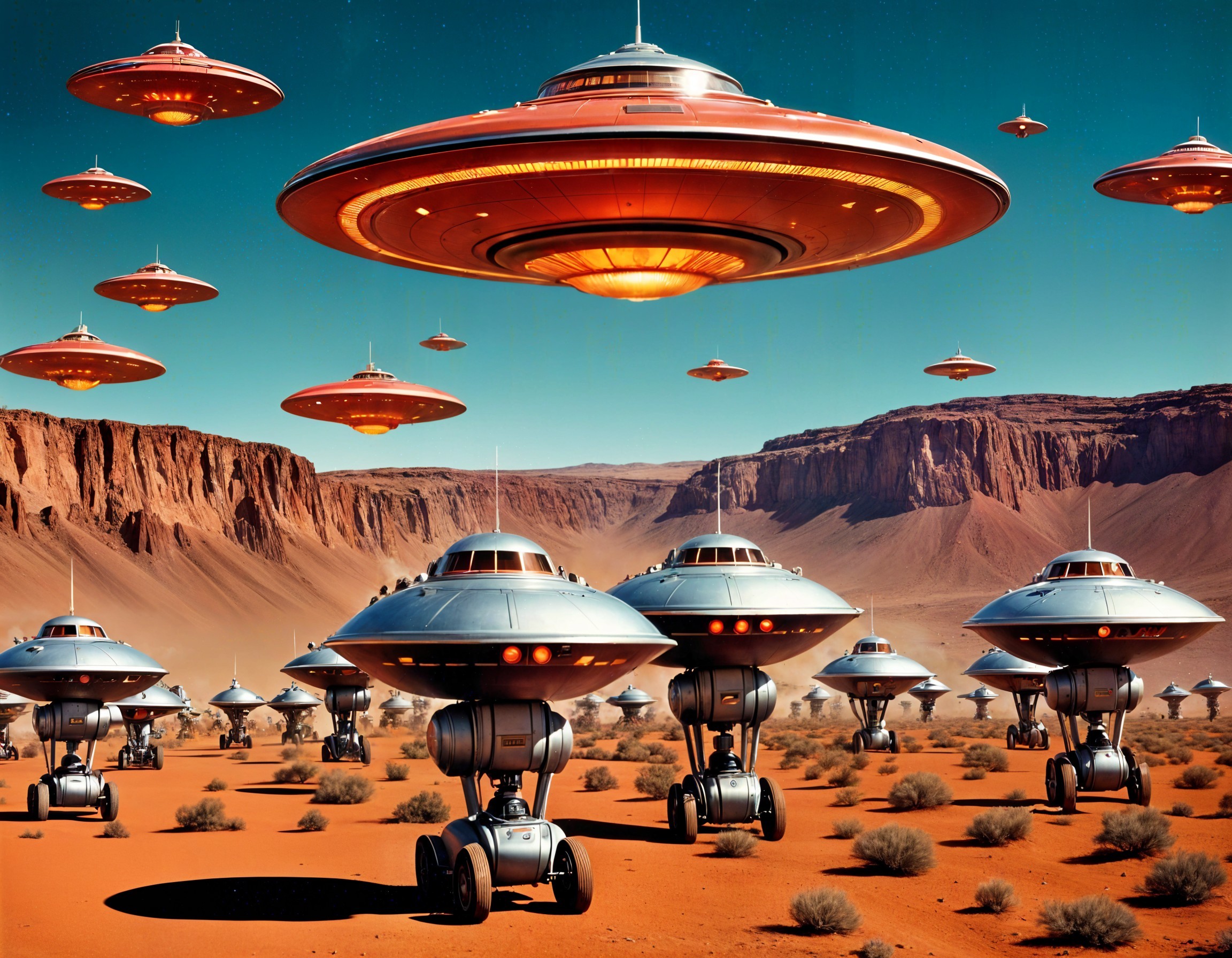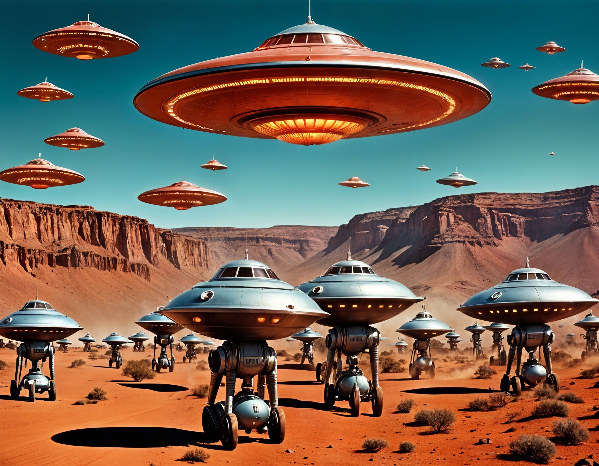 A futuristic desert landscape features numerous flying saucers hovering above, showcasing sleek metallic designs and glowing interiors, with majestic cliffs in the background.