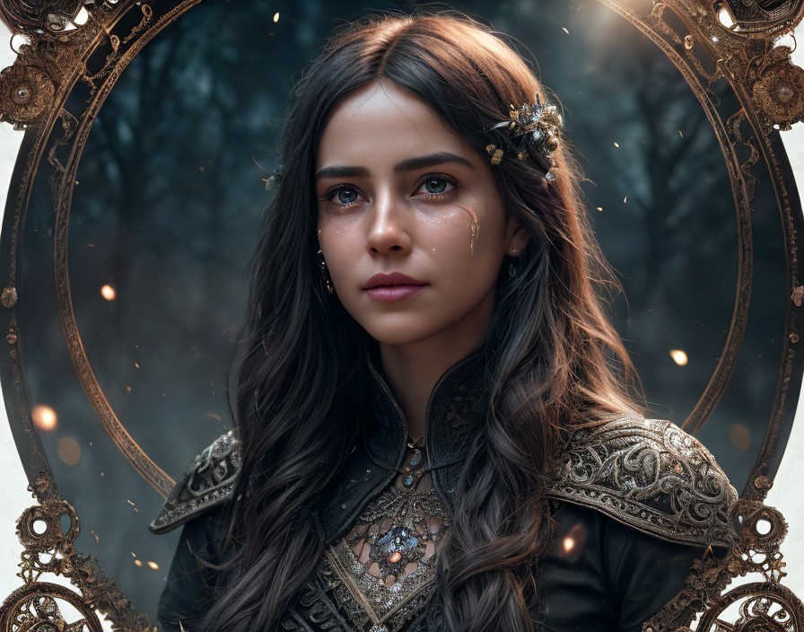 Woman with floral hair adornments in mystical forest setting and ornate mirror.