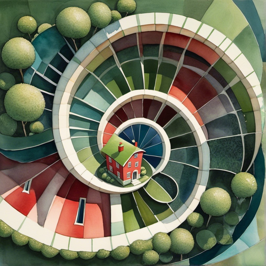 *A quirky house with a striking red and white chequered facade, unusual chimneys, and oddly shaped windows. A sage green vintage car, a pond with abstract, geometric ripples, trees with stylized blossoms, fluffy, white clouds.