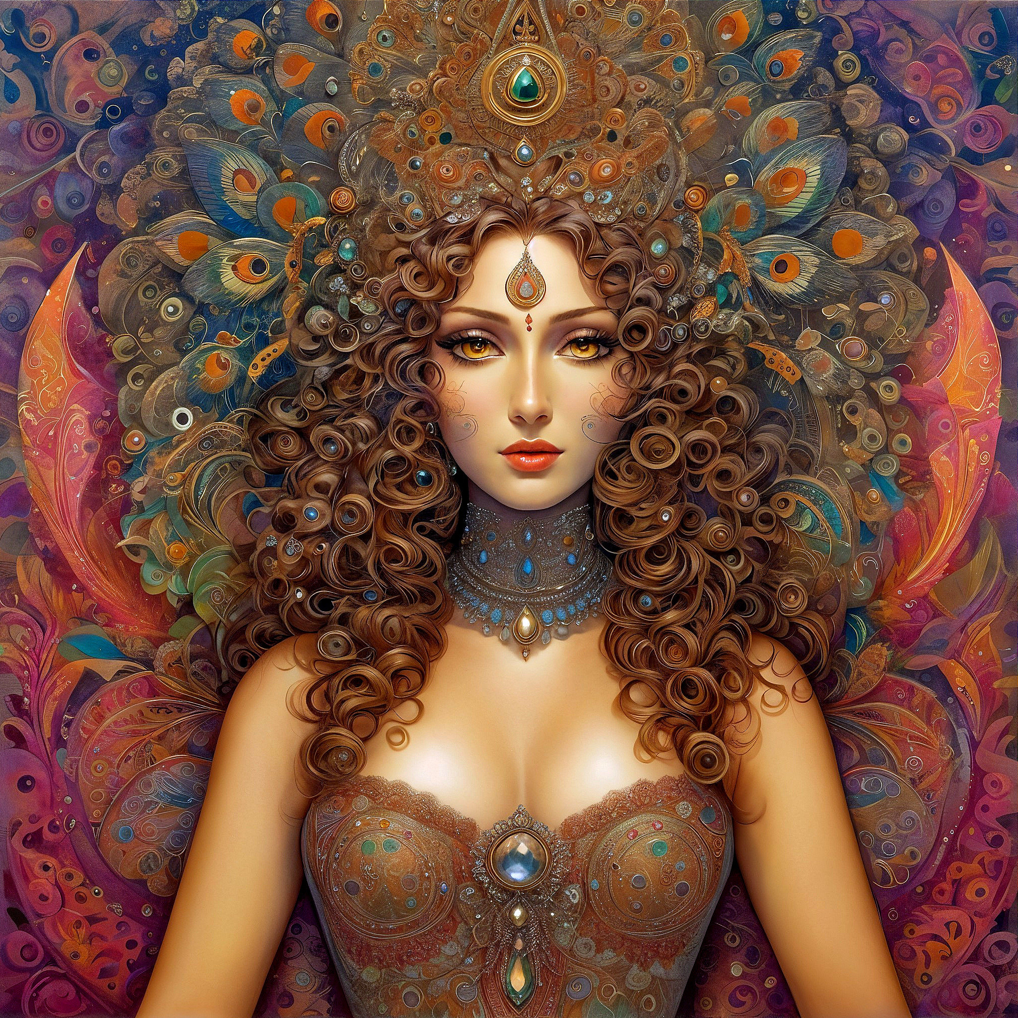 Description: a detailed illustration of a woman adorned with intricate, colorful peacock feather motifs and ornate jewelry with a mystical aura.