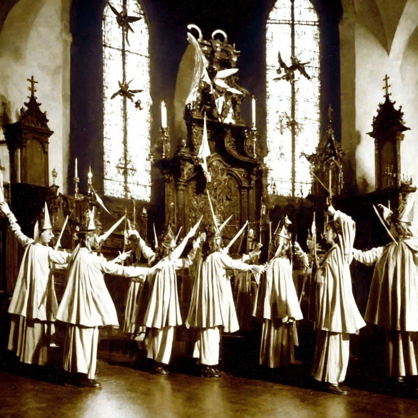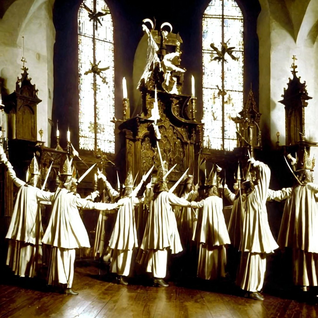 Prompt: ""No-body expects the Spanish Inquisition" - Ballett Dancing choreography on the church altar made of children's tears In the year 1720 AD. obscene complacency with insect wings and the Veil of cunning and cunnilingus in the name of the Lord and the crown of the rod. Claws with golden fingernails. Long slimy tongues sticking out of the mouths and gathering for flesh. Devilish priests of God. Hellfire with chicken wings. Torture equipment as the Garrote, Pear of anguish, Mouth prop, Breaking wheel, Spanish boot."