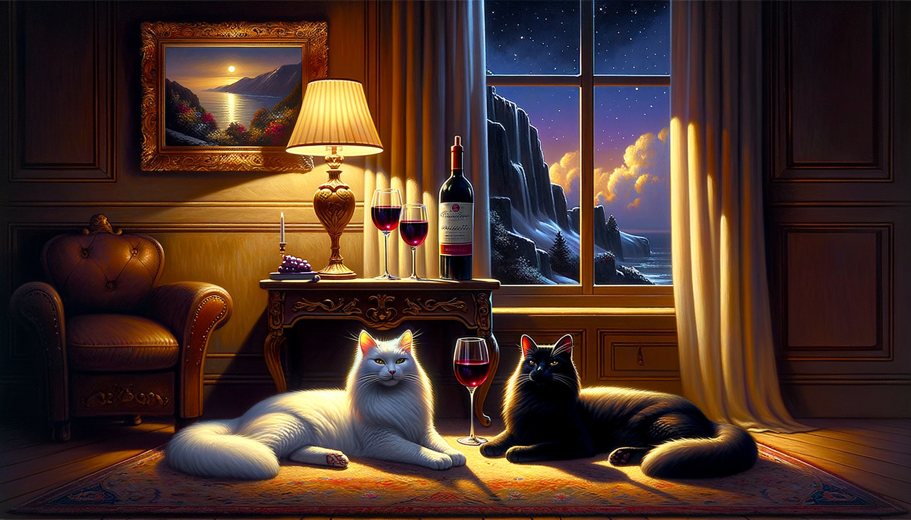 Two cats, one white and one black, lounge in a cozy room with a lamp, armchair, and snowy view outside the window.
