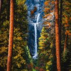 A breathtaking waterfall cascades down rugged cliffs, surrounded by vibrant autumn foliage and evergreen trees. The golden light enhances the serene beauty of the tranquil landscape.