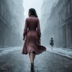 A woman in a flowing red dress walks away down a misty, rain-soaked street. The atmosphere is moody and somber, with shadows and reflections enhancing the scene's dramatic effect.
