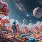 A surreal landscape features vibrant, fluffy pink trees and whimsical mushrooms. An astronaut stands in awe amidst the dreamy scenery under a starry sky, blending nature and fantasy.