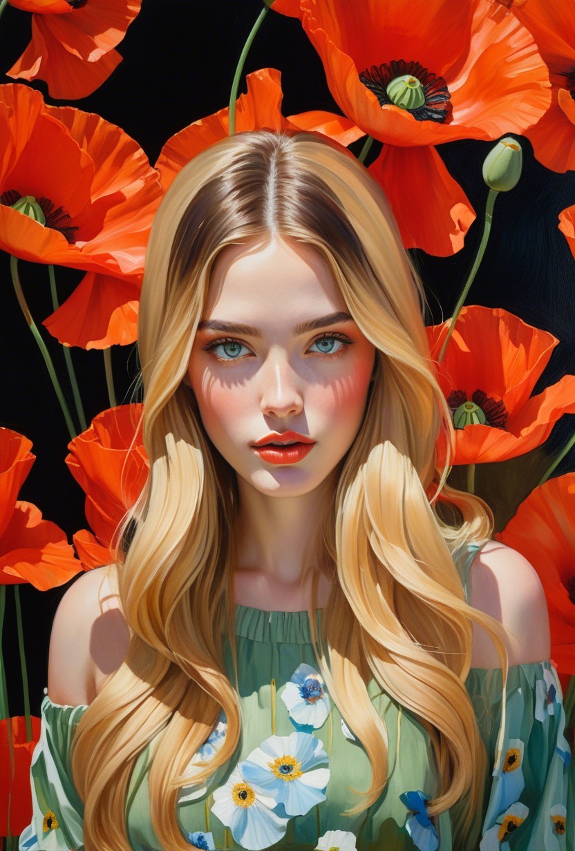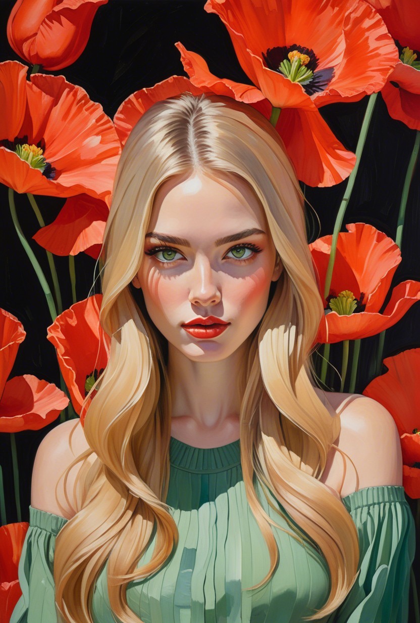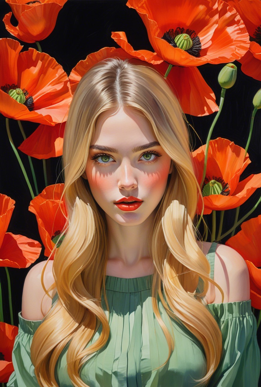 A striking portrait of a young woman with long, flowing blonde hair, wearing a green off-the-shoulder top, set against a vibrant backdrop of red poppies. Her intense gaze captivates the viewer.