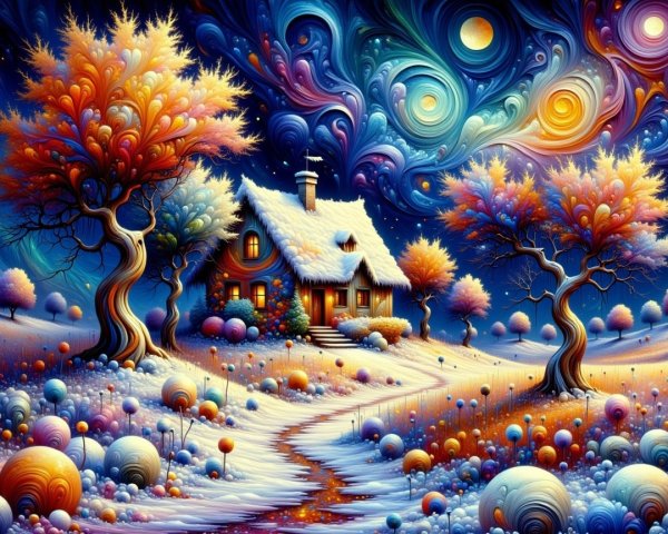 A mystical woman with flowing red hair holds a white cat. She wears a purple gown adorned with flowers and stars, surrounded by vibrant clouds and a surreal landscape of colors.