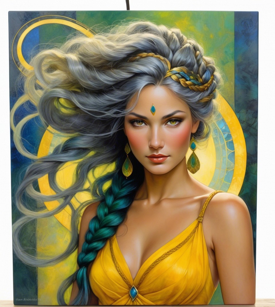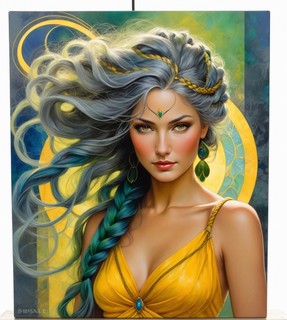Prompt: An acrylic portrait featuring a fusion of Freda people and Susan Seddon Boulet styles. Enchantress with intricate braided hair, upper body portrait, Cloisonné technique, overspray of wavery thinnend paint, dripping, whimsical setting, vibrant yellow, green, deep blue, soft grey hues, luminism, Stan Lee influence, strong intense outlines saturated palette reminiscent of John Hoyland, zentangle design with a foampunk twist, incorporating champlevé watercolor technique, unique texture, intricate hatching textures. Utilize thick visible strokes and fine lines, dramatic lighting, warm hues, colorful shapes,warm colors, chiaroscuro, gothic fantasy with whimsical ornate details and intricate lighting to create a beautiful and detailed view. tessellated, stippled, sculpted, retrofuturistic, 1990s fantasy art, liminal, plasticity 1.6, luminosity 1.3, subject embodies a 1970s animated female character with blonde-brownish hairstreaks, adorned with textured fabrics, opaque, cel-shaded, highlighted by intricate brushstrokes creating rhythmic patterns and ochre tones, enhancing the depth and scale of the artwork, debeh, bokeh, dof, 128k, wide-angle view, influences from the Harlem Renaissance art movement, post-avantgarde style, hairstyle is intricately detailed, reminiscent of Ho Baron's style, high coloring and stylized gouache painting by Noma Bliss. translucent fractalization techniques, cinematic and 3-point lighting,, colorful acrylic art Stylized Patchwork, featuring elements of ho baron,Jeremiah Ketner, Earl Moran styles.1980s Vintage decoupage, portraying a textured beautiful female face partially obscured by silver particles, color scheme of green yellow grey, milky mist, foampunk, Bloom-Effect. The artwork is executed using gouache and impasto techniques on coarse-grained silky texture emphasizing textured line details and depicting shades, warm, pastel tones chlorite dark green, burnt sienna. Incorporate raytraced shadows and auripigmentum for added depth.