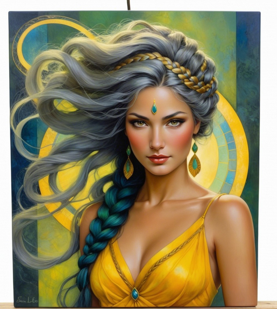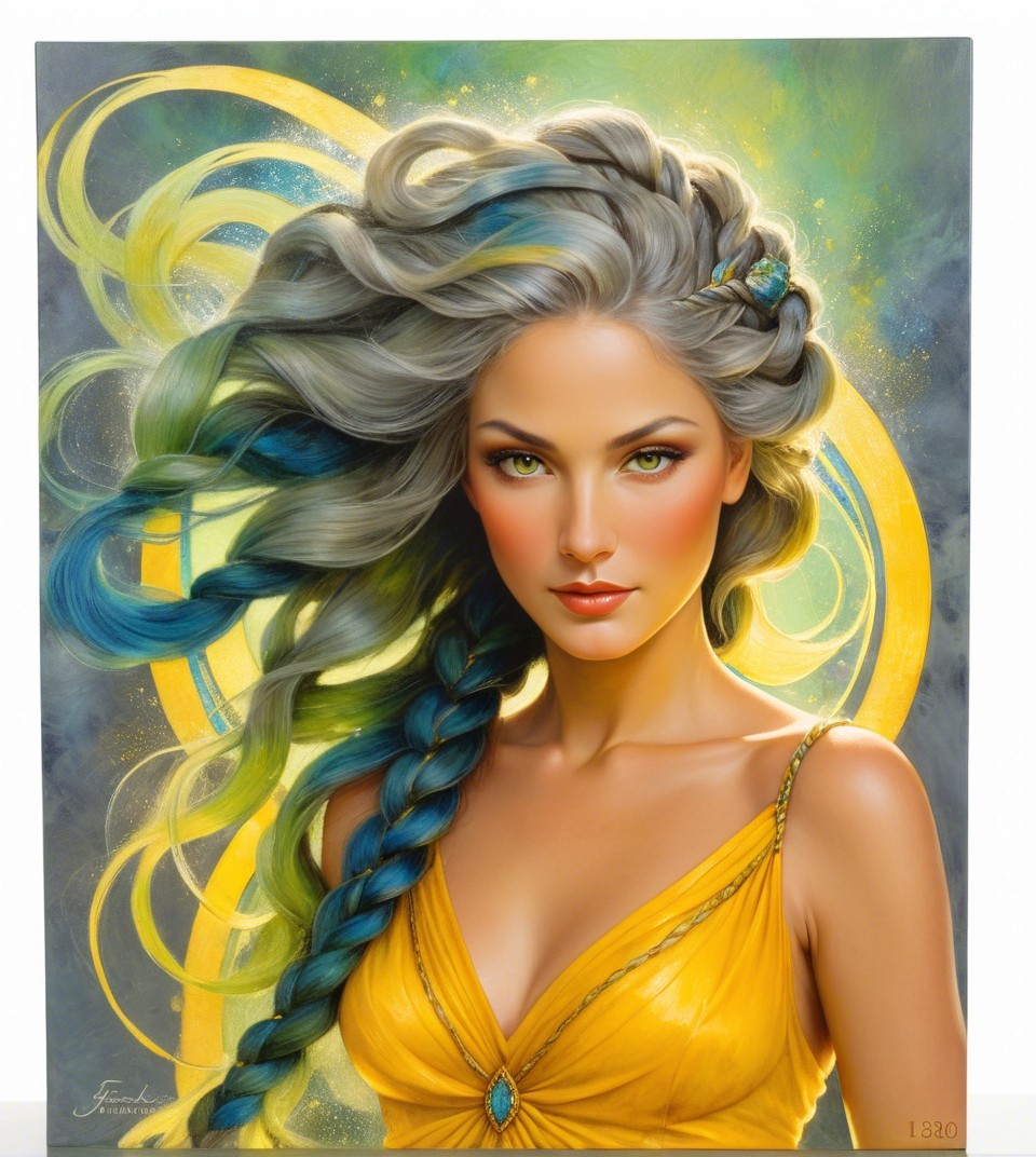 An acrylic portrait featuring a fusion of Freda people and Susan Seddon Boulet styles. Enchantress with intricate braided hair, upper body portrait, Cloisonné technique, overspray of wavery thinnend paint, dripping, whimsical setting, vibrant yellow, green, deep blue, soft grey hues, luminism, Stan Lee influence, strong intense outlines saturated palette reminiscent of John Hoyland, zentangle design with a foampunk twist, incorporating champlevé watercolor technique, unique texture, intricate hatching textures. Utilize thick visible strokes and fine lines, dramatic lighting, warm hues, colorful shapes,warm colors, chiaroscuro, gothic fantasy with whimsical ornate details and intricate lighting to create a beautiful and detailed view. tessellated, stippled, sculpted, retrofuturistic, 1990s fantasy art, liminal, plasticity 1.6, luminosity 1.3, subject embodies a 1970s animated female character with blonde-brownish hairstreaks, adorned with textured fabrics, opaque, cel-shaded, highlighted by intricate brushstrokes creating rhythmic patterns and ochre tones, enhancing the depth and scale of the artwork, debeh, bokeh, dof, 128k, wide-angle view, influences from the Harlem Renaissance art movement, post-avantgarde style, hairstyle is intricately detailed, reminiscent of Ho Baron's style, high coloring and stylized gouache painting by Noma Bliss. translucent fractalization techniques, cinematic and 3-point lighting,, colorful acrylic art Stylized Patchwork, featuring elements of ho baron,Jeremiah Ketner, Earl Moran styles.1980s Vintage decoupage, portraying a textured beautiful female face partially obscured by silver particles, color scheme of green yellow grey, milky mist, foampunk, Bloom-Effect. The artwork is executed using gouache and impasto techniques on coarse-grained silky texture emphasizing textured line details and depicting shades, warm, pastel tones chlorite dark green, burnt sienna. Incorporate raytraced shadows and auripigmentum for added depth.