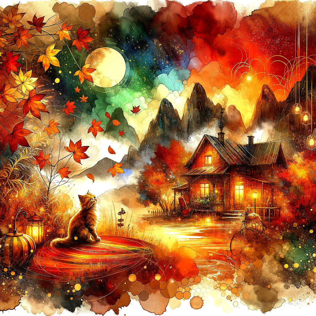 A cozy autumn scene features a black cat on a swing, overlooking a serene lake at dusk. Vibrant orange and red leaves surround a quaint house and majestic mountains, under a glowing moon.