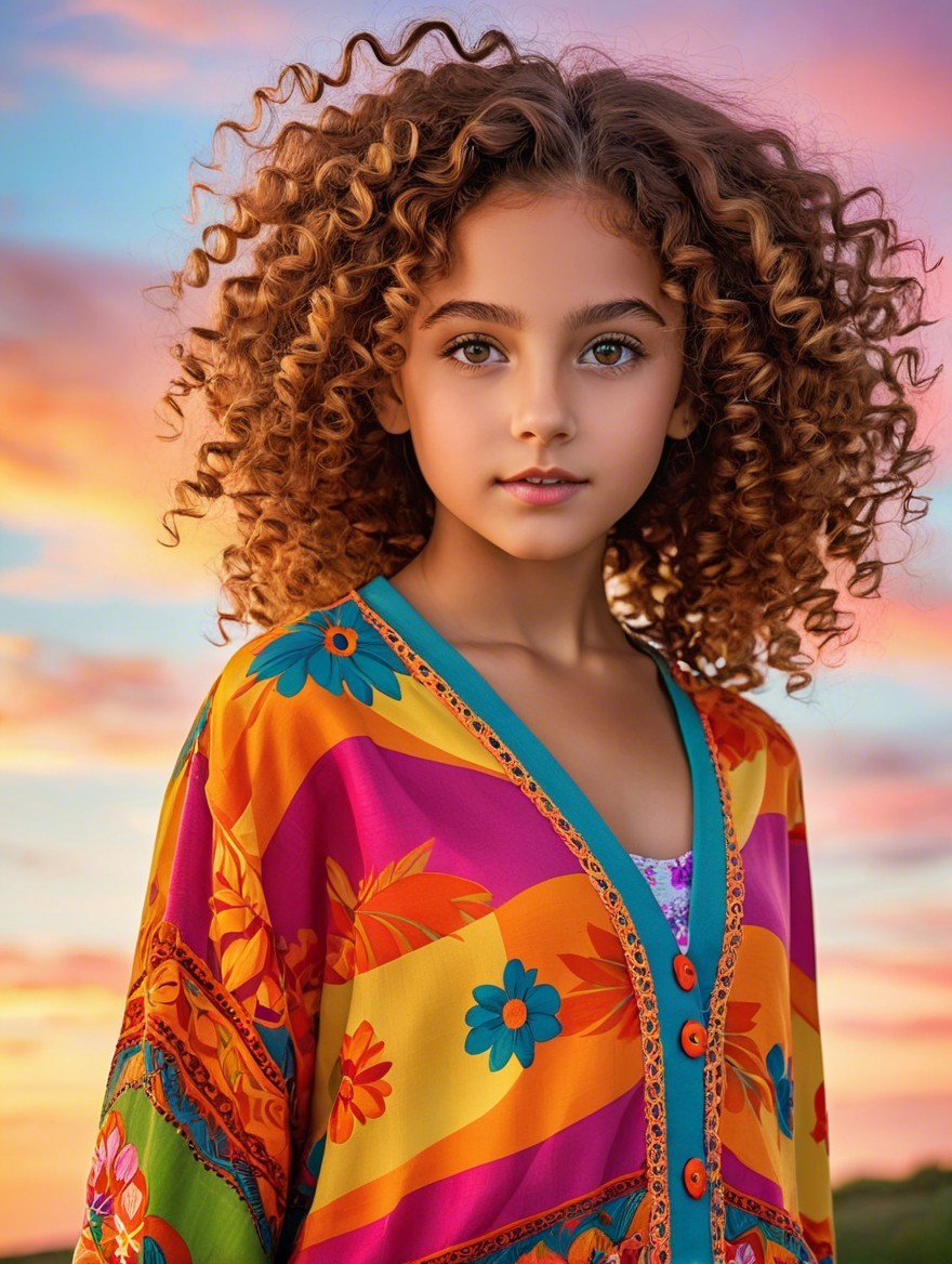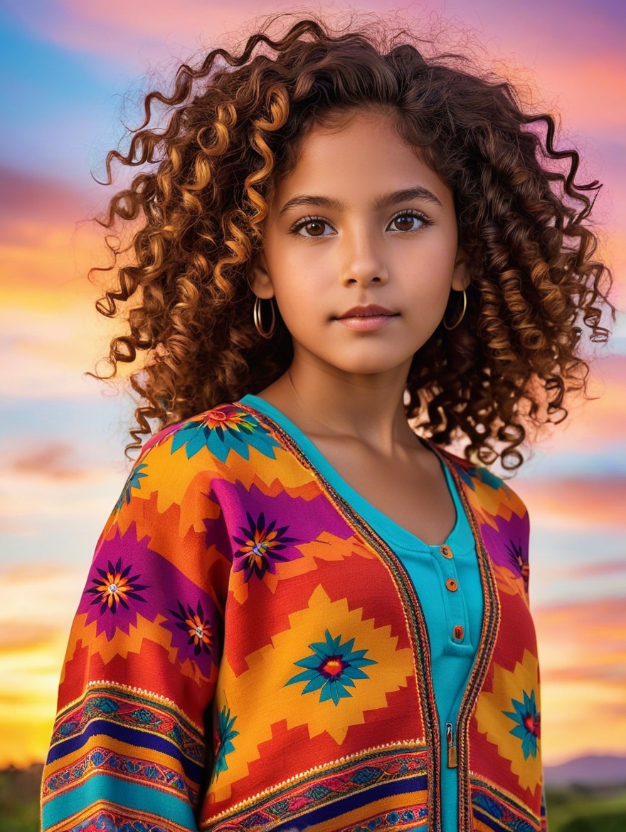 A young girl with beautiful, curly hair stands against a vibrant sunset. She wears a colorful, patterned sweater, conveying a warm and inviting atmosphere. Her expression is calm and confident.