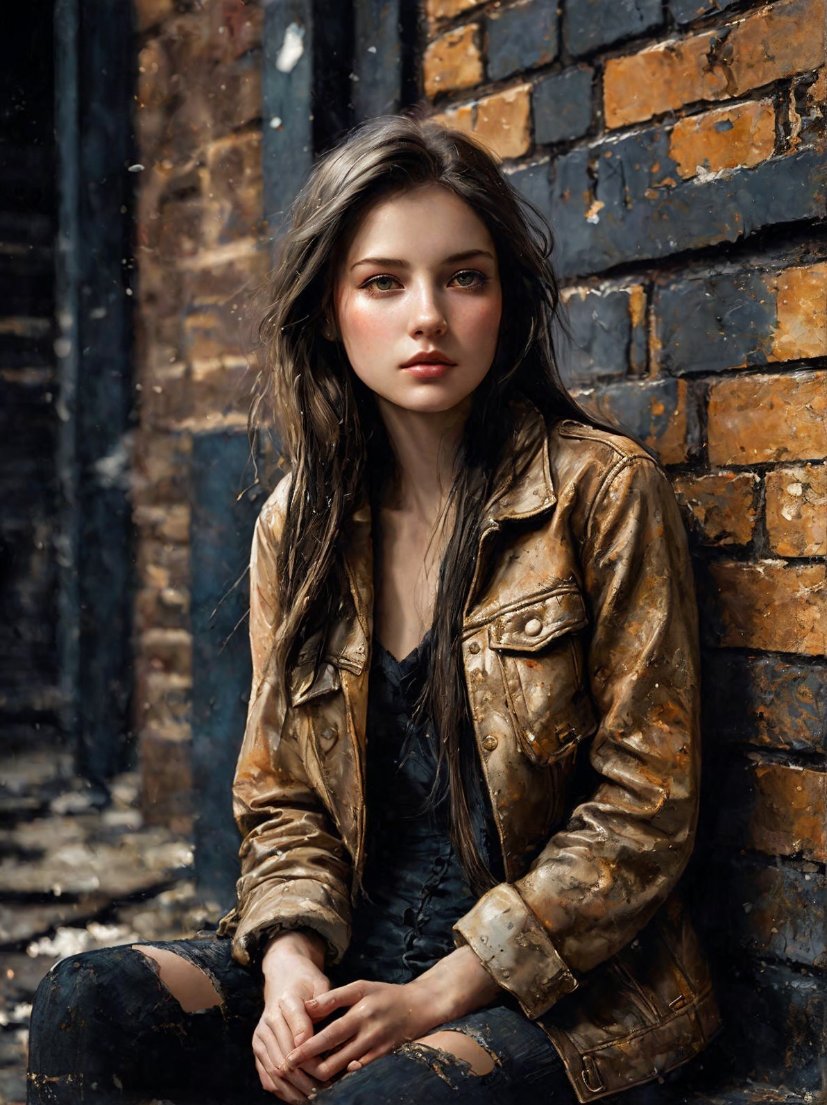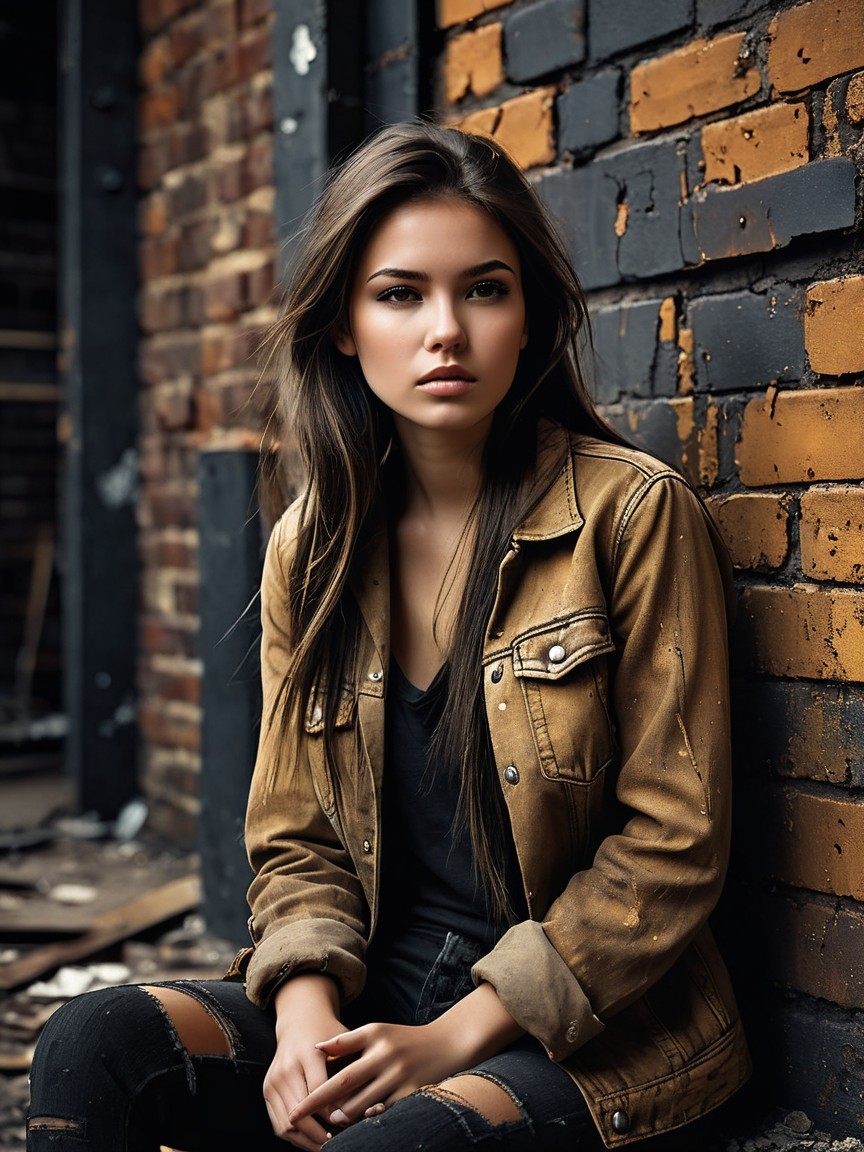 A young woman with long, tousled hair sits against a brick wall, wearing a worn leather jacket and black lace top. Her expression is calm, with soft makeup accentuating her features.