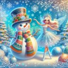 A whimsical winter scene features a cheerful snowman wearing a festive hat and scarf alongside a magical fairy in a sparkling ice-blue dress, surrounded by colorful ornaments and Christmas trees.